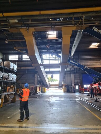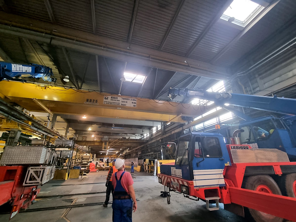 Die Arbeiten wurden zusätzlich durch Versorgungsleitungen von Luft, Gas und Stromschiene auf der linken Seite sowie einer begrenzenden Gebäudewand auf der rechten Seite erschwert. Präzise Zentimeter- und Millimeterarbeit war erforderlich, um den Kran sicher an den Hindernissen vorbeizuführen und wieder sicher aufzusetzen.