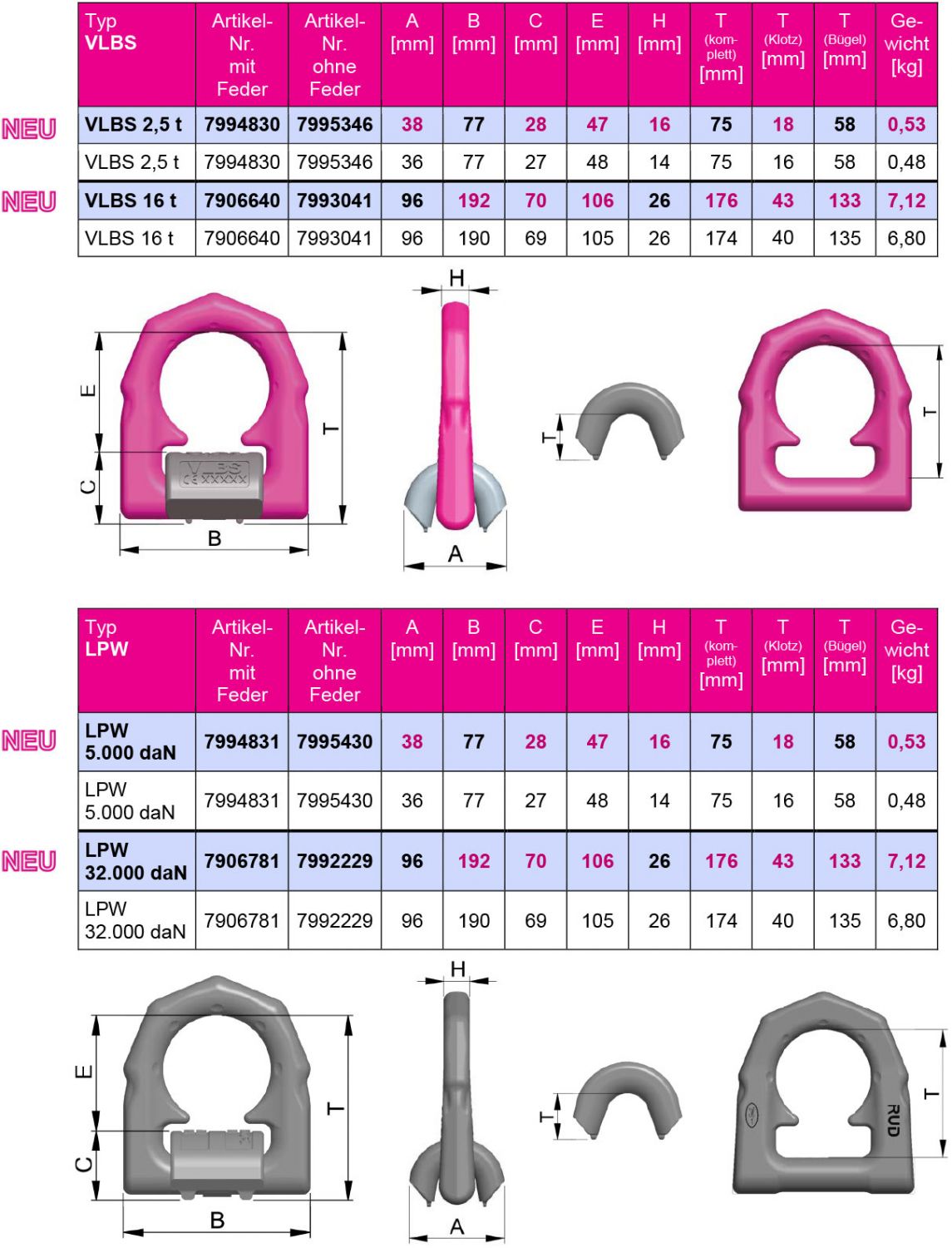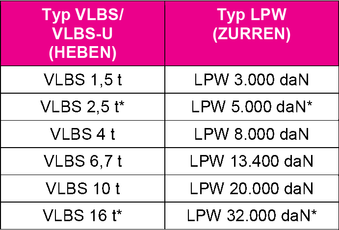 *Lediglich beim VLBS 2,5 t / LPW 5.000 daN sowie beim VLBS 16 t / LPW 32.000 daN ergeben sich dadurch kleine Maß- und Gewichtsänderungen (vgl. nachfolgende Tabellen).